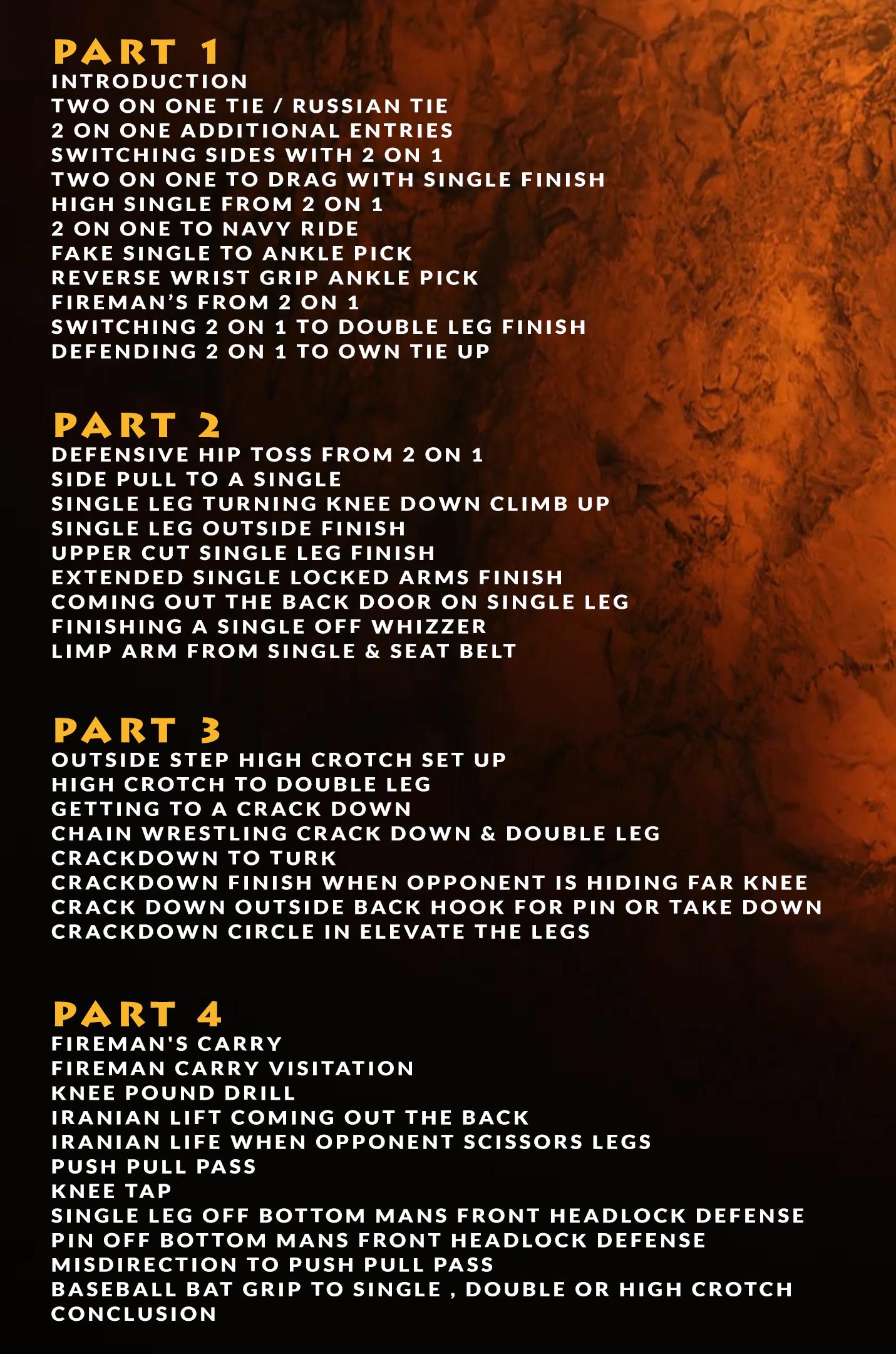 Dan’s knowledge and expertise doesn’t just stop when he gets in on the takedown, he is a master at finishing against even the most stubborn athletes. His key? Relentless attacks and bulletproof technique, getting his whole body in the right positions so that he is using leverage and not brute strength to accomplish his task. The single leg takedown can be one of the hardest to complete on a scrambling opponent, so be sure to watch and learn all of the details that you need as Dan goes through finish after finish. From elevating the ankle (and keeping them from starting the scramble), to finishing quick mid-level, or how to turn bad, stretched-out shots into real points with some clever backdoor elevations, Dan shows a single leg that will work for you the next time you can’t seem to turn that attack into 2. He even gets deep into the dreaded crackdown, showing how to keep from getting stalemated and stood back up, and instead ending up on top and in control consistently and cleanly.